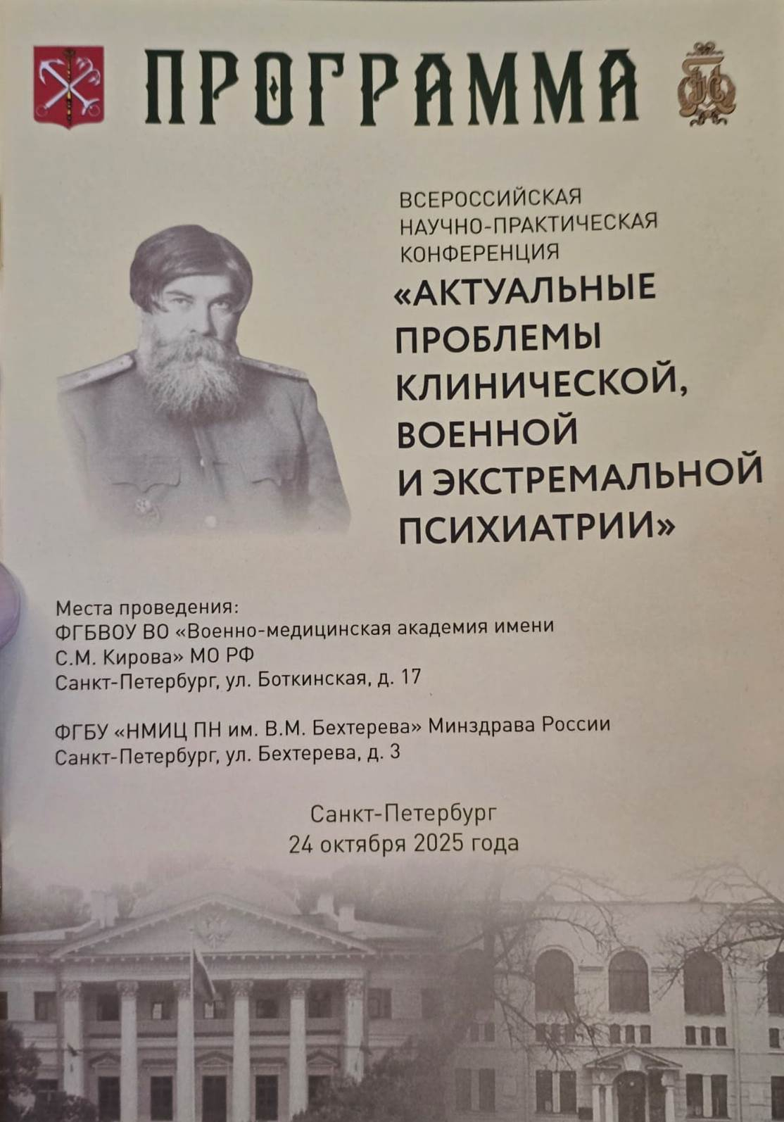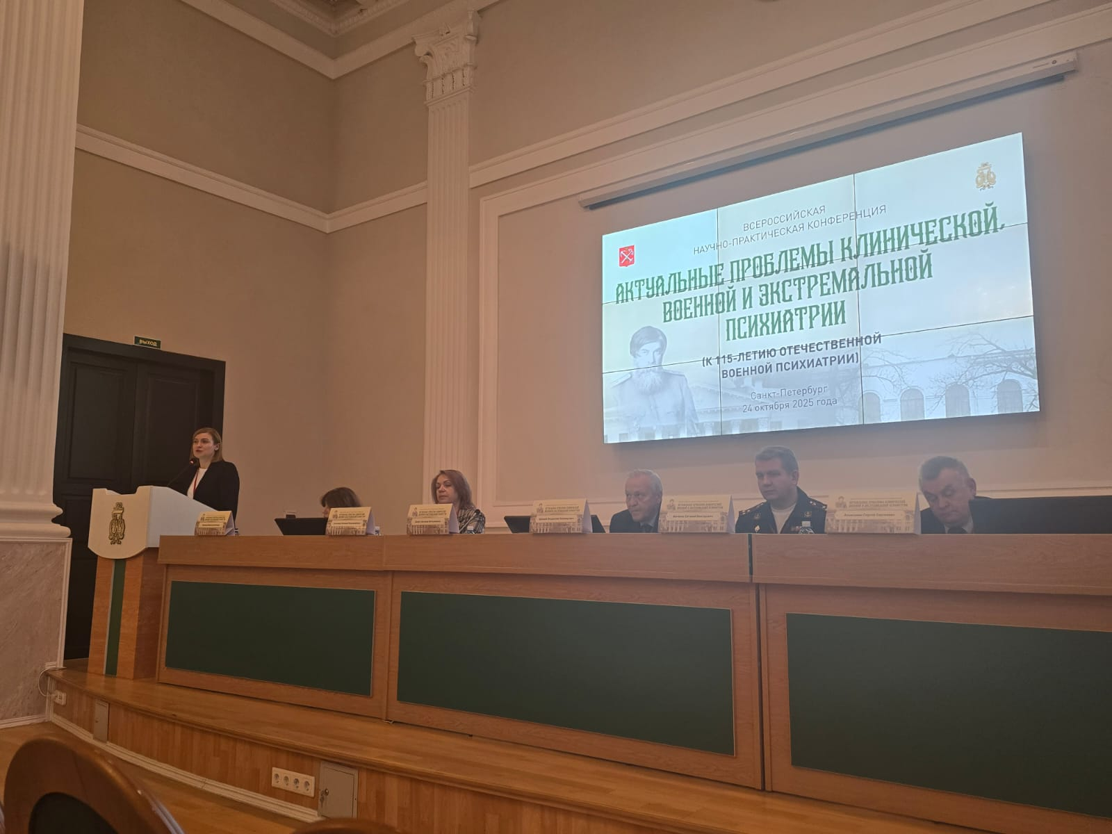 24 октября 2025 года в г. Санкт-Петербурге состоялась Всероссийская научно-практическая конференция «Актуальные проблемы клинической, военной и экстремальной психиатрии». Директор ФГБУ ВЦЭРМ им. А.М.Никифорова МЧС России Алексанин С.С. выступил на пленарном заседании с приветственным словом в качестве члена организационного комитета. Заместитель директора (по научной и учебной работе, медицине катастроф) Рыбников В.Ю. участвовал в расширенном заседании секции "Военная и экстремальная психиатрия" Российского общества психиатров, в качестве модератора секции.